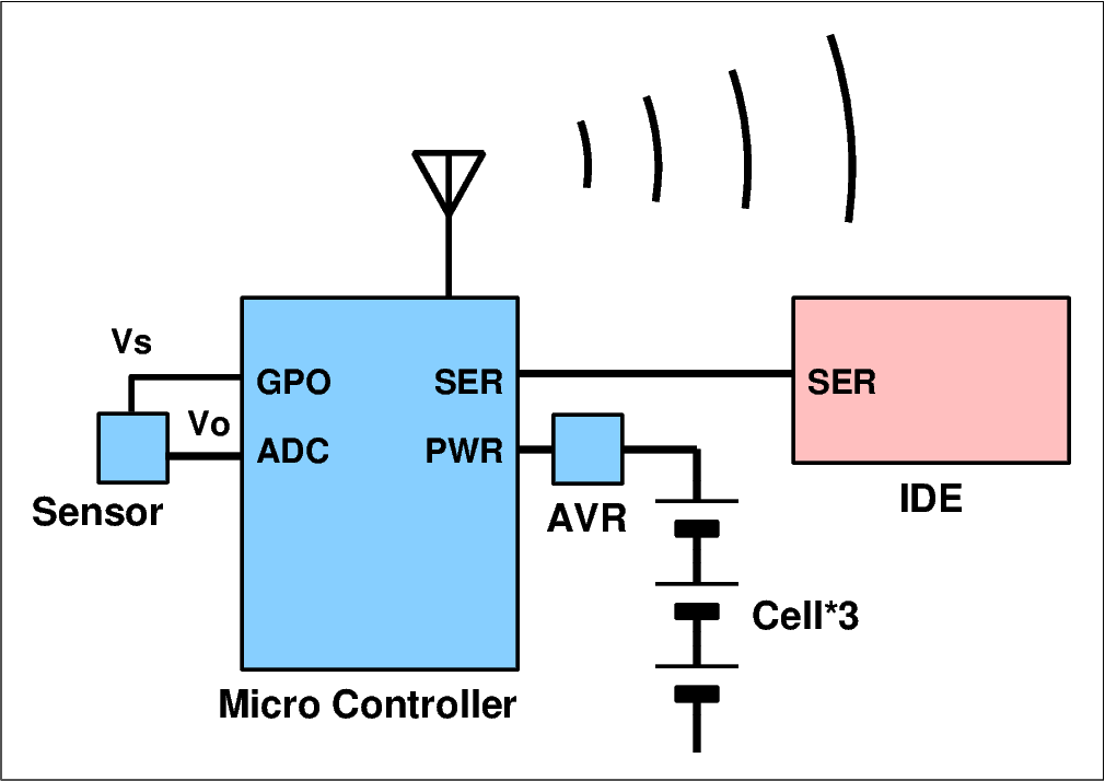 → 電池の電圧変動がセンサの出力電圧に影響を与えるため、センサのVSにレギュレータ(UT7500など)を挿入する。