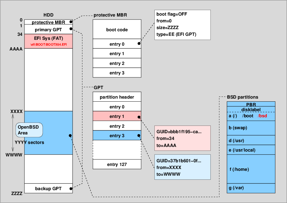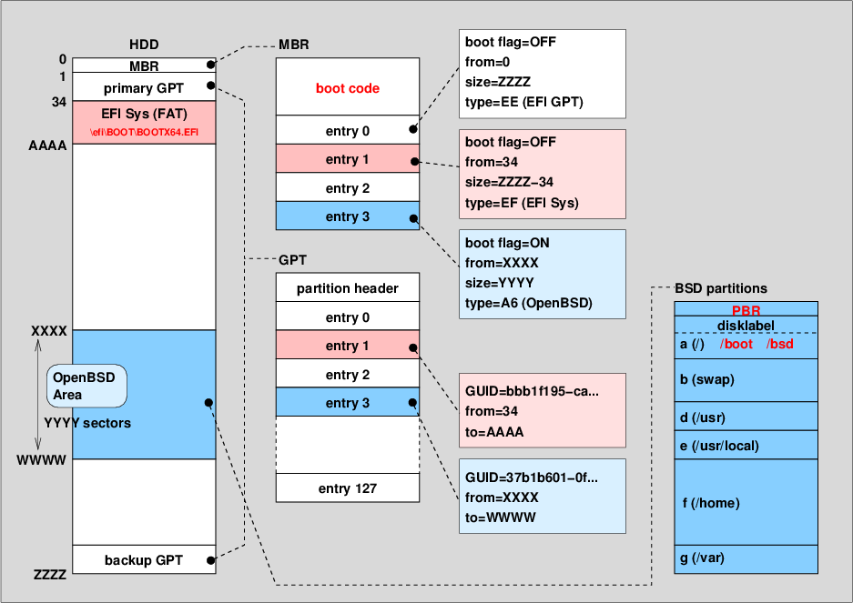 OpenBSDでのUEFI実装で説明したように、OpenBSDのfdiskコマンドにはディスクをMBR、GPTそれぞれのパーティションで初期化する機能を持っているが、MBRとGPTを同時に作成しHybrid MBRとする機能は持っていない。