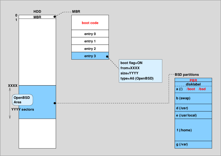 OpenBSDでは、ブートローダの書込みにinstallboot(8)を使用する。
