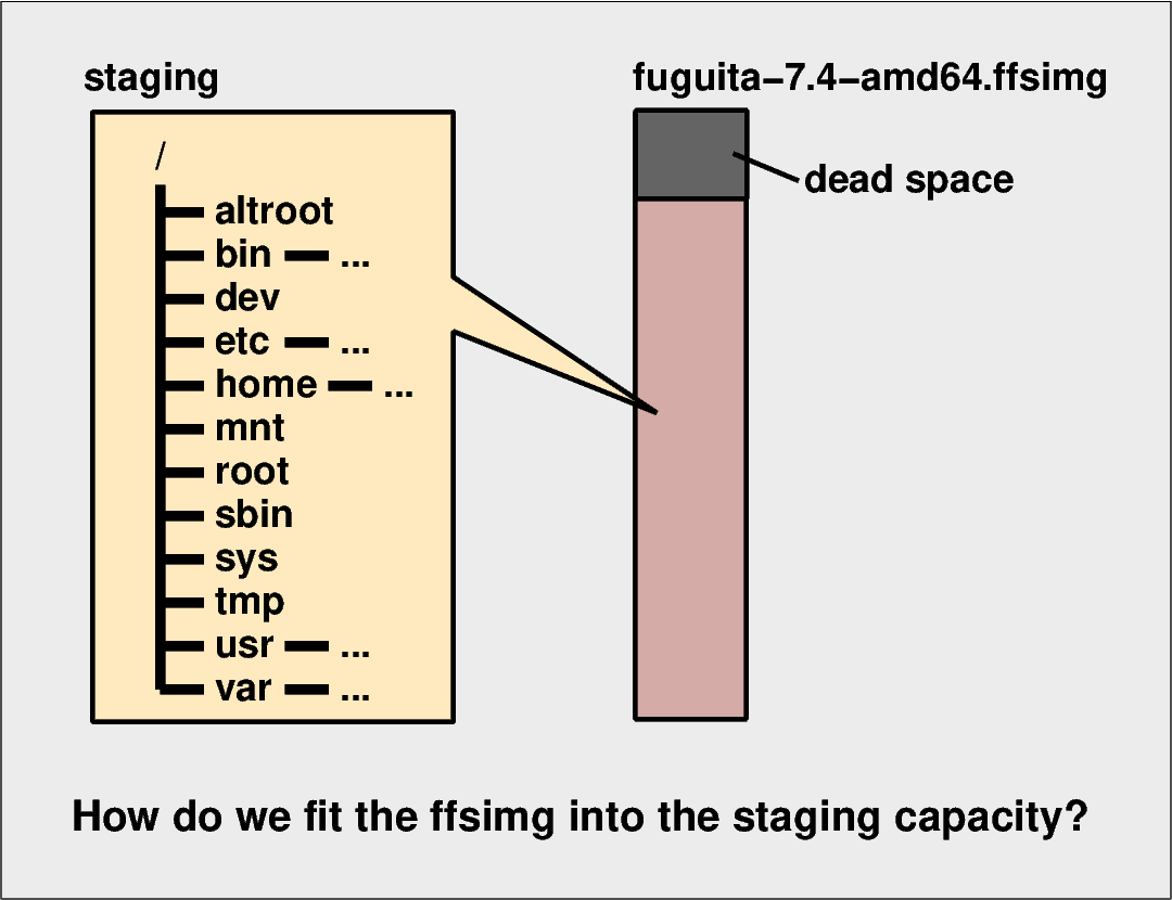 - どれだけ余分に必要かはイメージファイルがFFS1かFFS2か、ブロック/フラグメント長、inode密度、stagingそのもののサイズとその中に含まれるファイル数、などによって変ってくる。