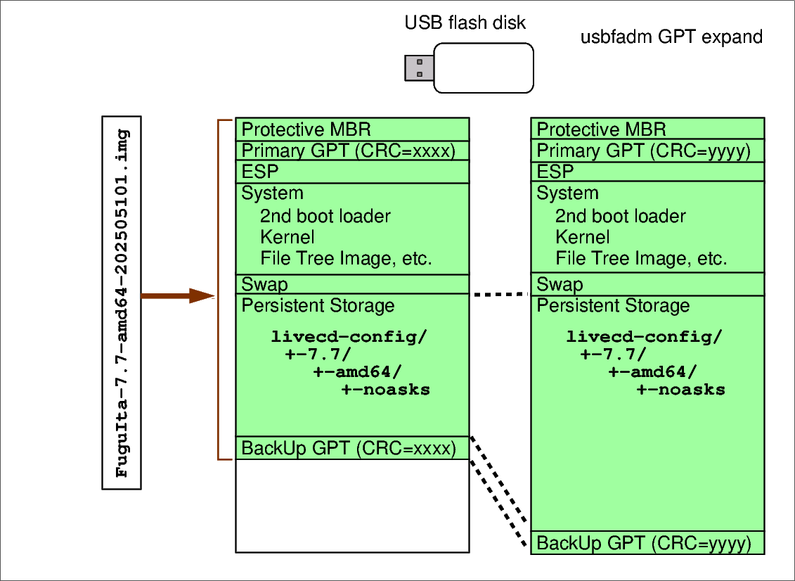 expand機能は、従来、MBRパーティションにのみ対応していた。河豚板LiveUSBの配布イメージはMBR+UEFIで行っており、これで必要十分であったが、GPTの場合にもデータ保存領域の拡張が行えるようexpand機能の改良を行った。