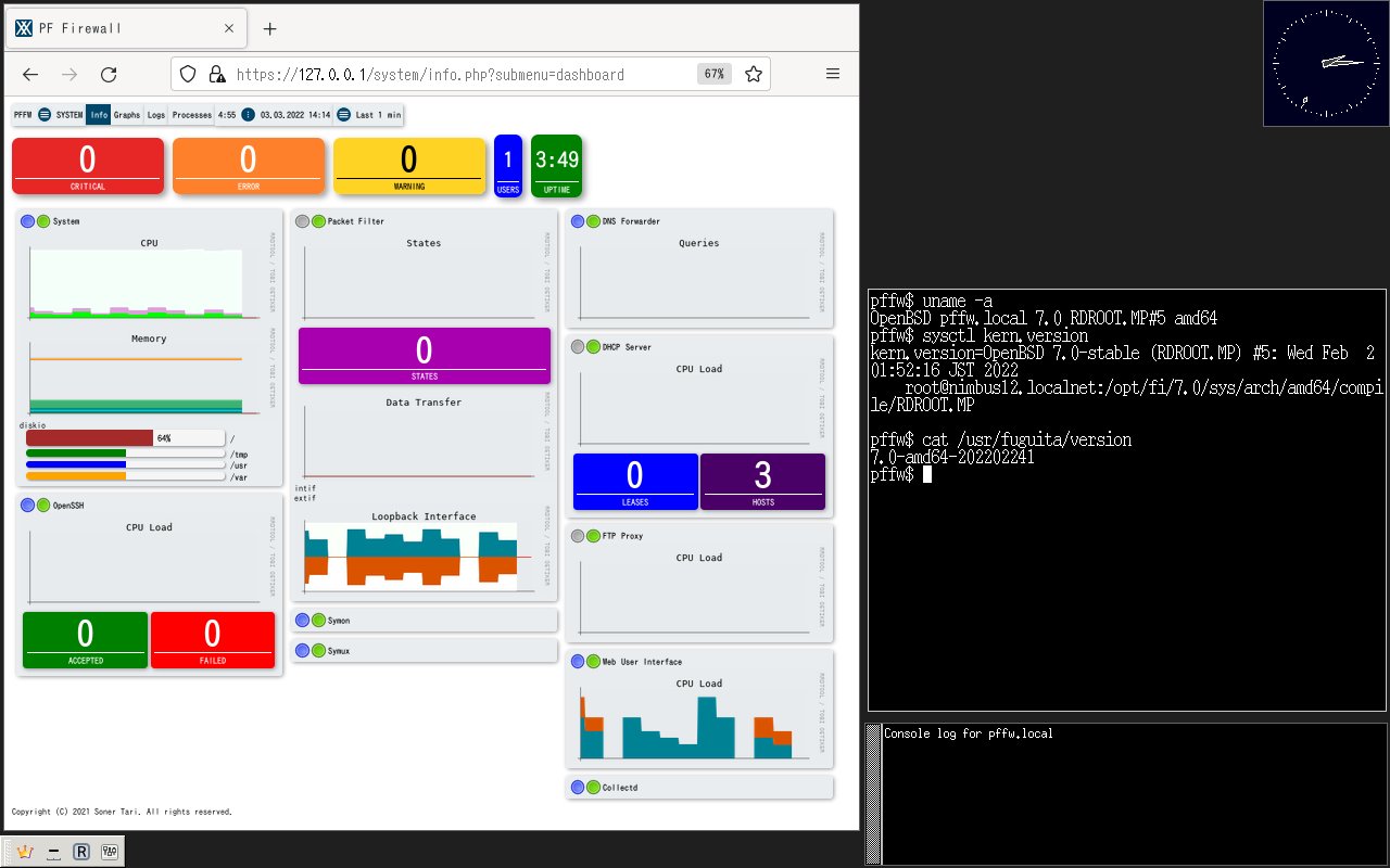 Save the modifications to the FuguIta LiveUSB.pffw-fuguita# usbfadm Welcome to usbfadm. USB flash drive administration tool for FuguIta Version/Arch: 7.0/amd64 (FuguIta-7.0-amd64-202202241) Boot mode: usbflash Target device: not set Data saved as: not set readline capability available TAB to complete the reserved words Type ? for help. ? : ? ->target Searching storage device Please make sure the device inserted. Then press ENTER -> sd0a +sd0d target device->sd0d sd0d : ? ->saveas Name of saved data->pffw Your data will be saved as ``pffw''. sd0d : pffw ->sync Sync current tmpfs as ``pffw'' , OK? [y/N] -> y copying /ram to /mnt/livecd-config/7.0/amd64/pffw (515360KB approx.): 467MiB 0:00:30 [15.2MiB/s] [==============================> ] 92% ETA 0:00:02 waiting for pax to finish ... syncing ... done. sd0d : pffw ->quit Bye bye... pffw-fuguita#This completes the porting of PFFW to FuguIta.