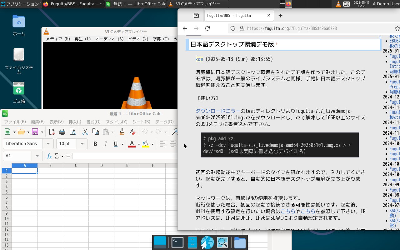 河豚板に日本語デスクトップ環境を入れたデモ版を作ってみました。 このデモ版は、河豚板が一般のライブシステムと同様、手軽に日本語デスクトップ環境が使えることを実演します。