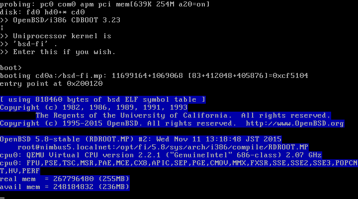 booting cd0a:/bsd-fi.mp: 12997960+2769928+2277408+0+708608\[806285+128+1028280+751803]=0x145cb88