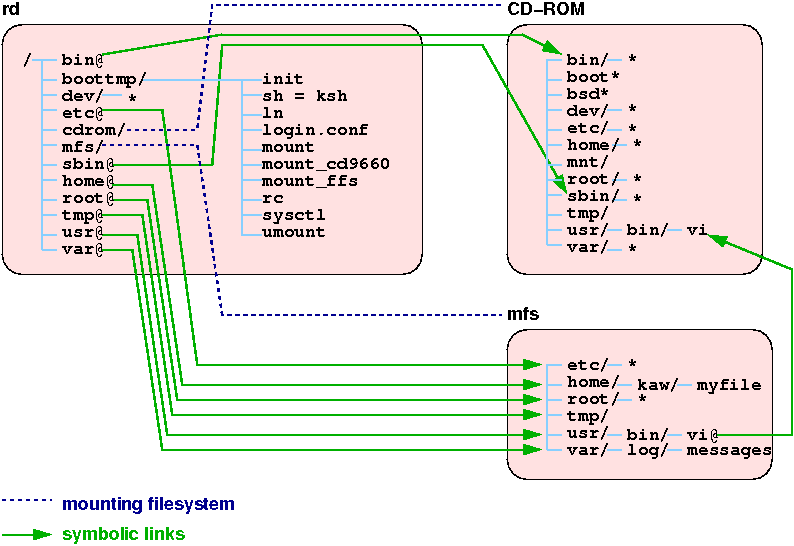 rdによるルートファイルシテムは存在しつづけ、CD-ROMは、/fuguitaに、mfsは/mfsにマウントされます。 そしてこれらのファイルシステムは、通常のUnixのファイル構造としてアクセスできるようにするため、シンボリックリンクが張られ(まくり)ます。 特に、/usr以下はシンボリックリンクが2段階で張られています。たとえば、/usr/bin/viにアクセスする場合は、