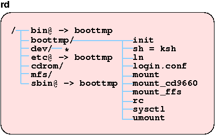rdファイルシステムには、起動のために必須な必要最小限のコマンド、設定ファイルのみ収録されています。 また、容量低減のためこれらは単一のディレクトリ /boottmp におさめられています。