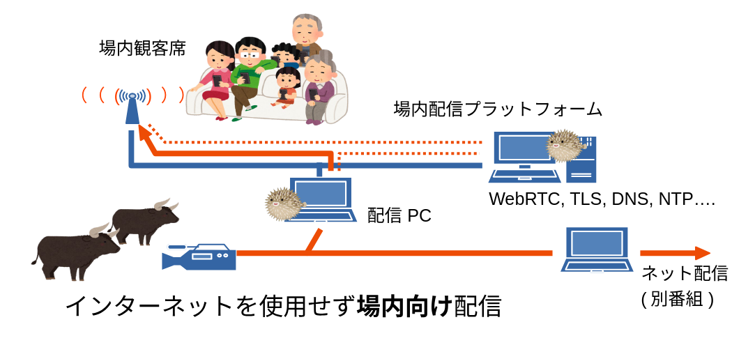 - 観客席へインターネットを介さずWiFiで直接配信 (Local 5G的な運用)