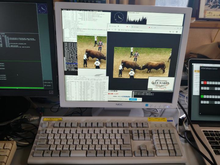 - 闘牛場のイベントMCと佐渡にいる鼓童リーダーとのトークの様子を見せるため