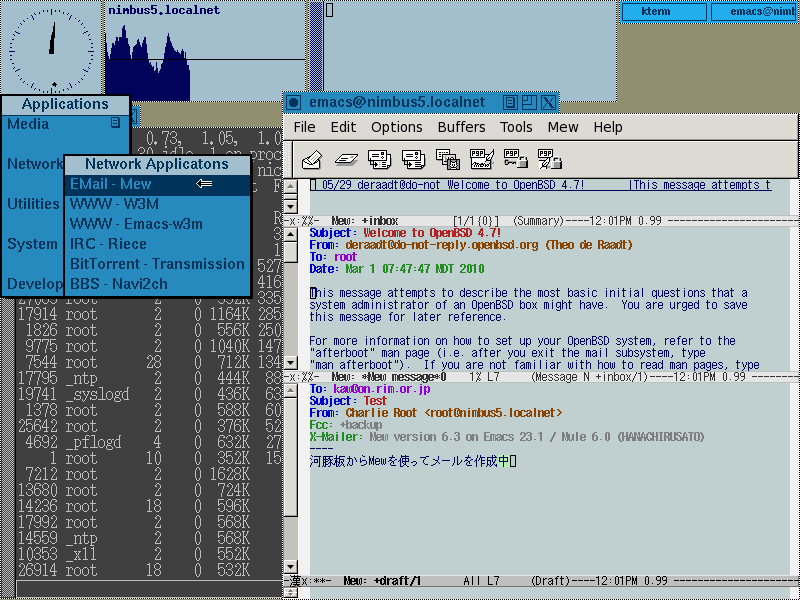 | IceWM and ROX-Filer (default) - Viewing root directory | twm - Reading/Writing emails with Mew | |