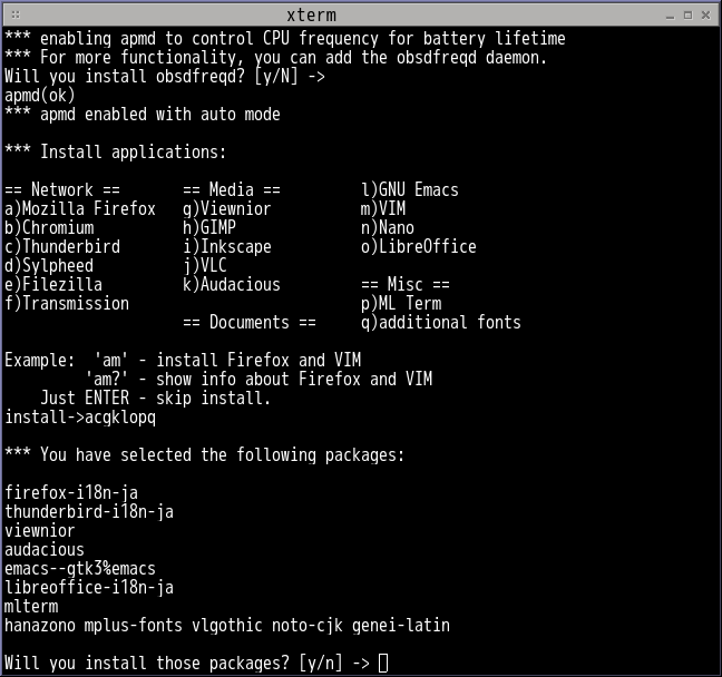 I’m currently improving dtjsetup (DeskTop (optionally Japanese) environment SETUP tool) in OpenBSD-based Live System FuguIta, and adding a feature to install commonly used applications.